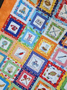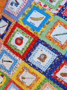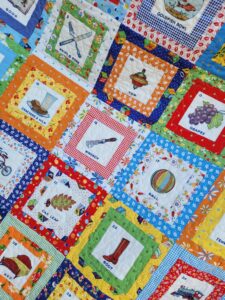 We have used the most gorgeous American Jane I Spy Panels from the Picture Perfect collection, together with co-ordinating American Jane prints to make this I Spy Quilt.